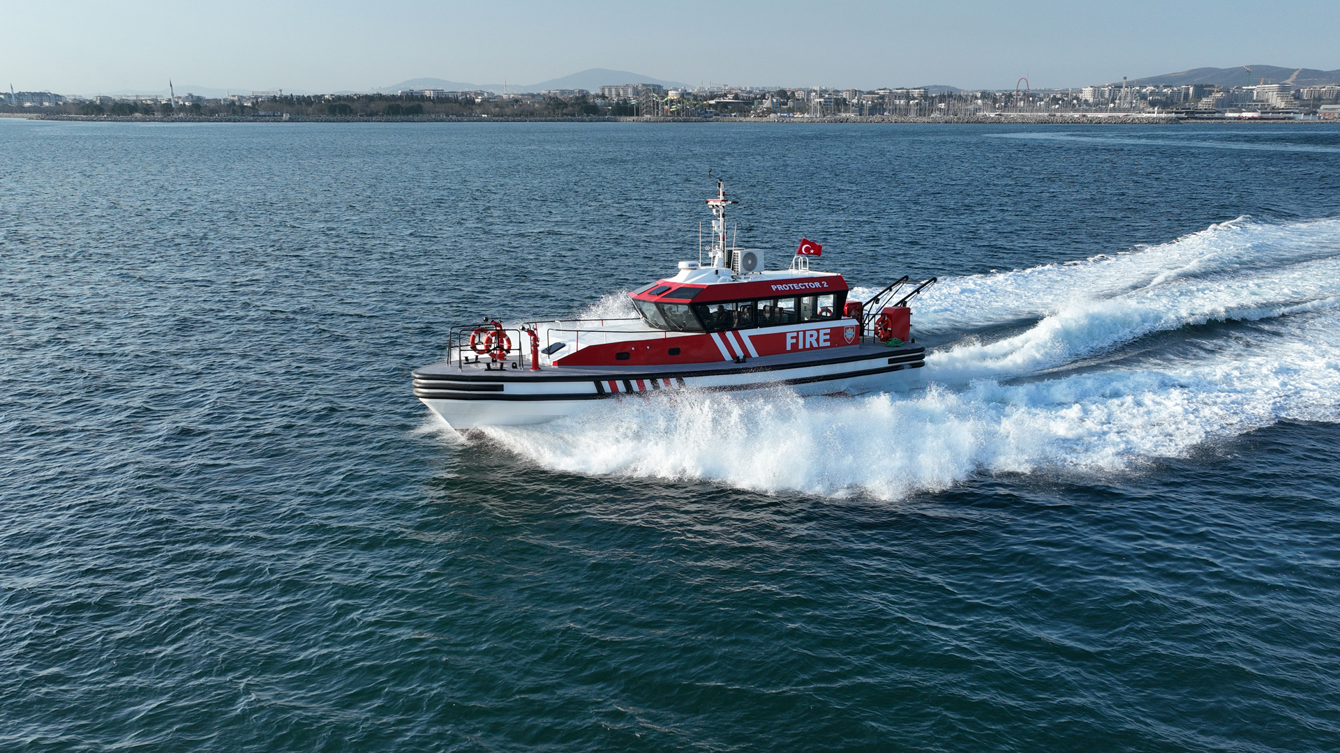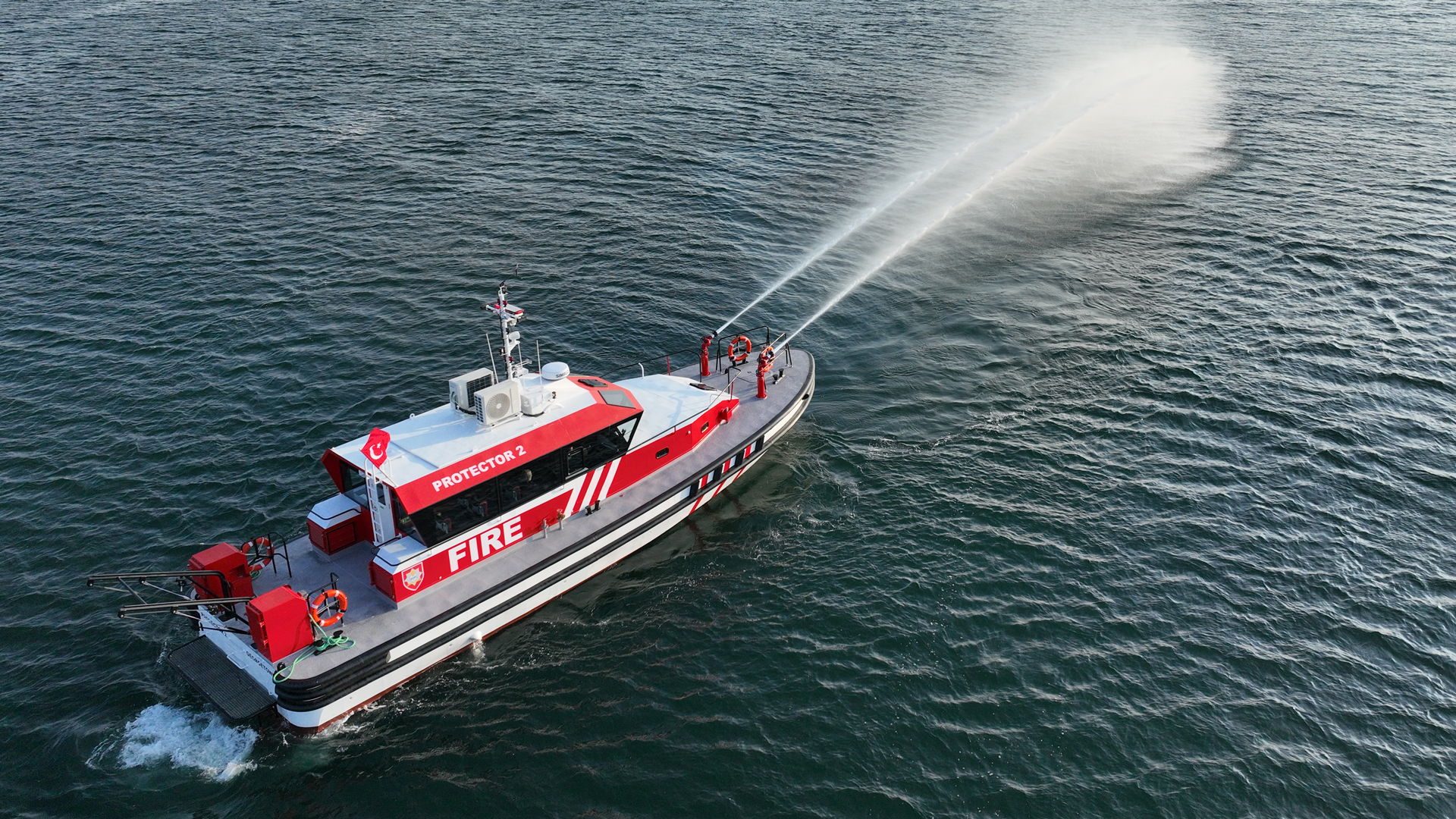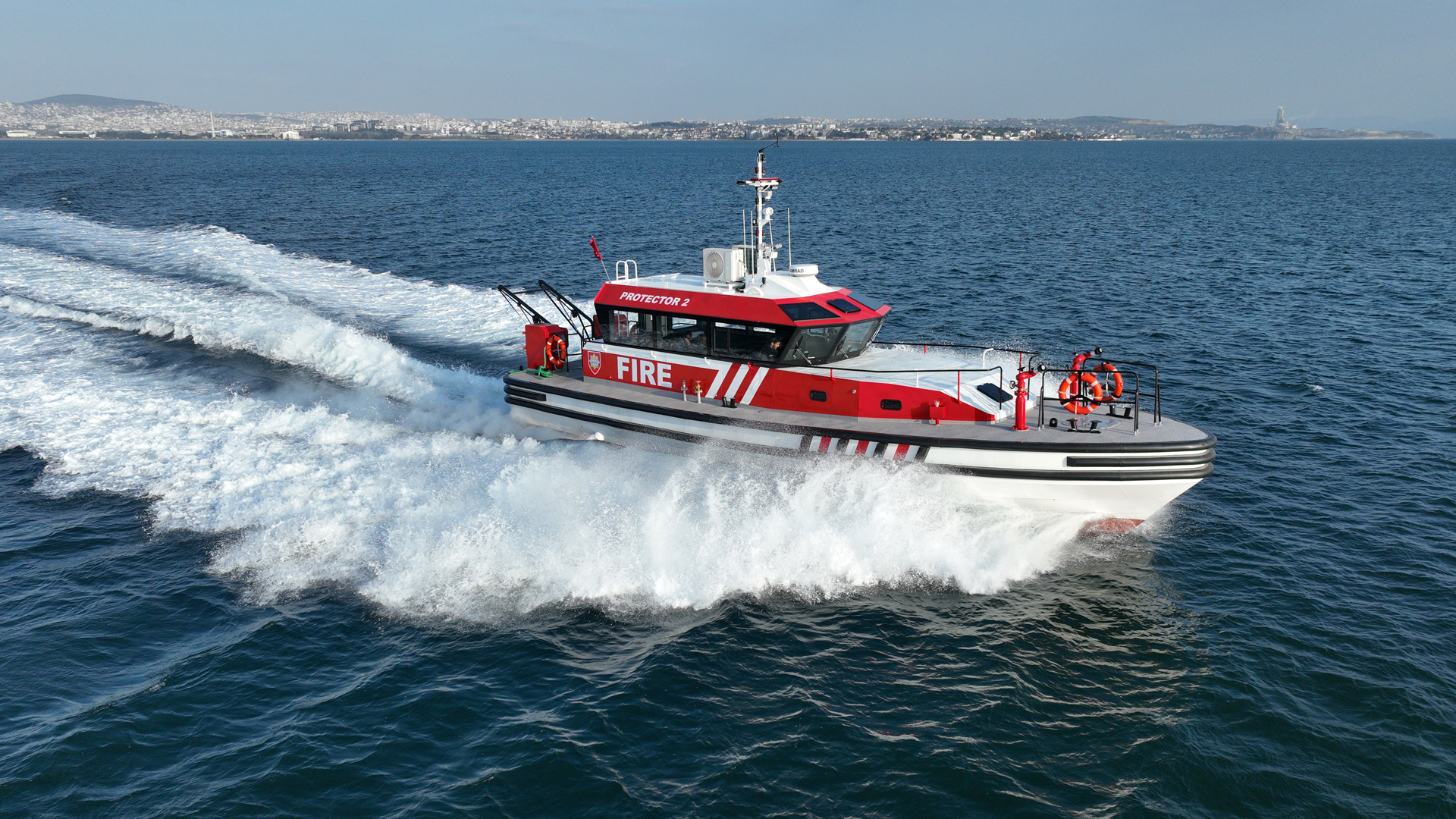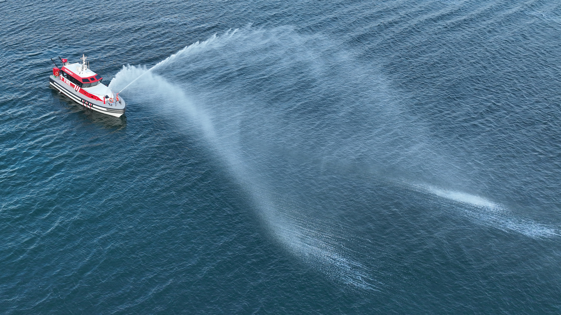 Designed and delivered by LOYD Shipyard for a UK-based operator, this 17-metre aluminum fire-fighting vessel represents the latest in purpose-built port and harbour emergency response. The deep-V planing hull combines a lightweight 5083-series aluminum structure with a wheelhouse engineered to withstand intense operational conditions, delivering top speeds of up to 30 knots with a cruising range of 300 nautical miles. Twin CAT C18 main engines, each generating 873 hp at 2,200 rpm via fixed-pitch propellers, ensure powerful and reliable propulsion across all sea states. A 600 m³/hr fire pump feeds dual manually-operated monitors and one remote-controlled monitor, providing flexible firefighting coverage from any approach angle. Fuel capacity of 2,800 litres — extendable to 3,800 litres with an external tank — combined with 900 litres of fresh water keeps the vessel self-sufficient for extended deployment. Crew accommodation is rated for 2 professional crew and up to 8 firefighters, reflecting the vessel’s role as a rapid, high-capacity emergency responder.